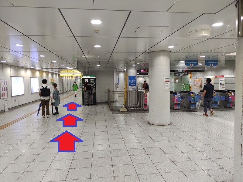 市営地下鉄の改札を出ると正面に東急乗換え改札口がありますが、乗換え口に入らず左側の出口2への通路へ進みます。