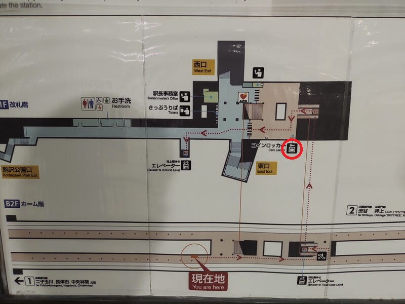 駒沢大学駅のコインロッカーは改札内にあり、改札を入って前方右奥の方に設置されています。